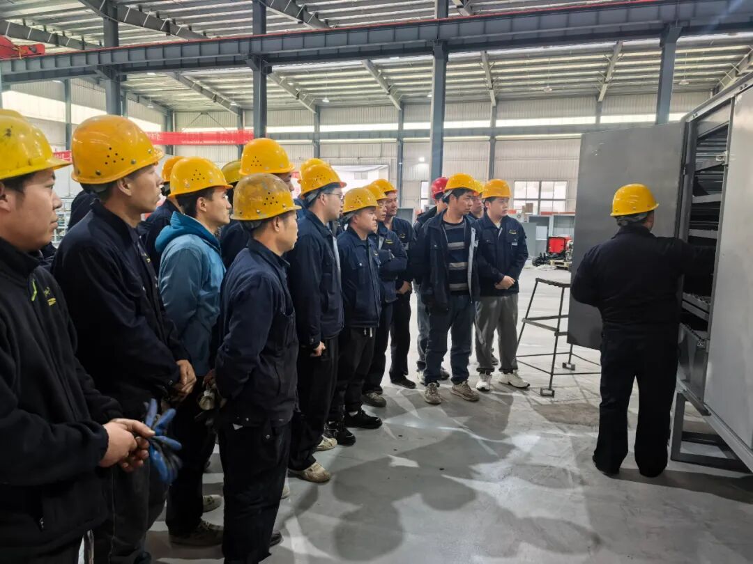 随后,生产部部长杨雄,带领大家到生产车间分别对烘干机、碾茶炉、输送连接设备、涡热机、鲜叶脱水机、鲜叶储青机等设备进行设备检修、保养及日常故障点讲解。他强调设备在工作后,检查、检修必须在设备停机状态下进行,杜绝所有的安全隐患。
