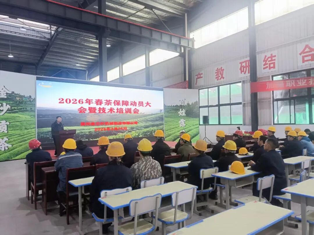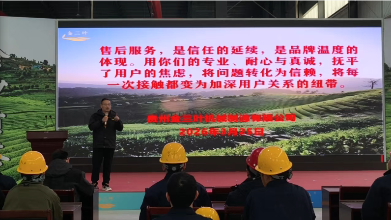 2026年3月25日上午,贵州金三叶机械制造有限公司在培训教室召开2026年春茶保障动员大会暨技术培训会。公司春茶保障人员全员参会,部分在外安装调试人员线上参会。会议由公司总经理助理兼销售服务部部长李星主持,总经理胡正军作动员讲话。